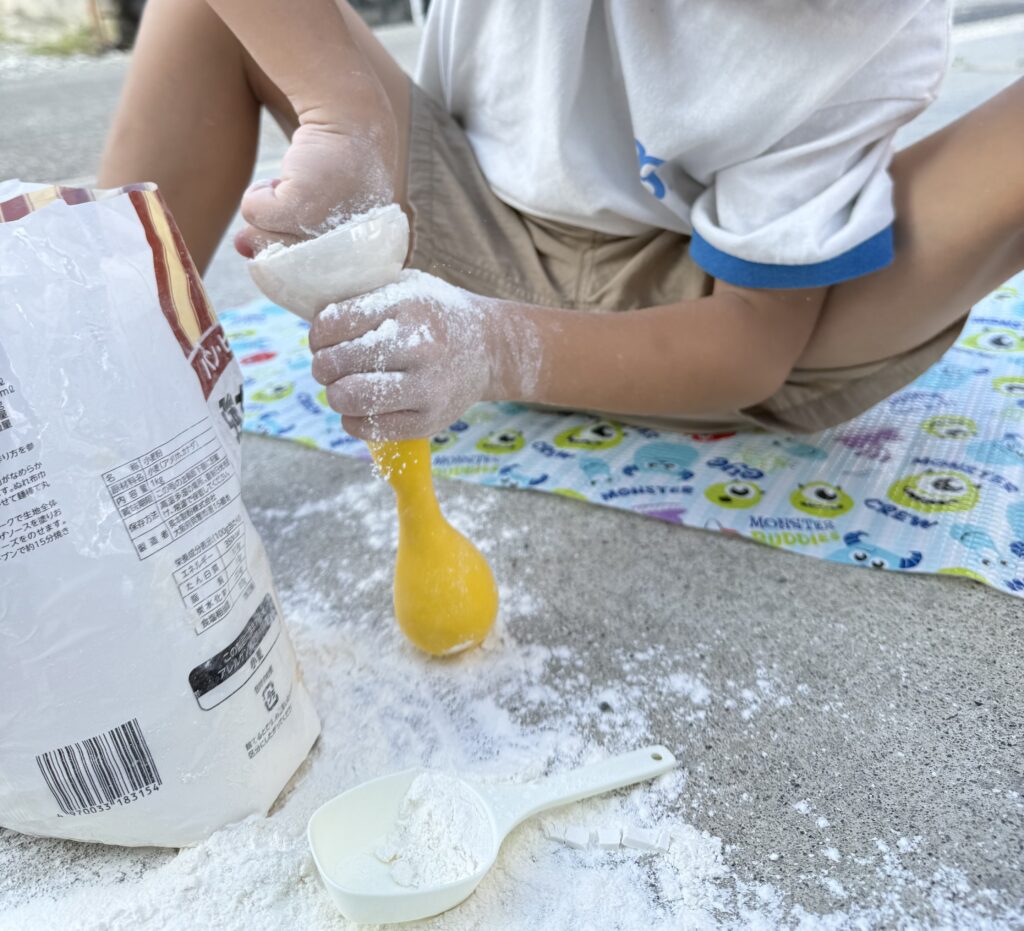 作り方はいたってシンプル。風船に小麦粉を入れたら完成。