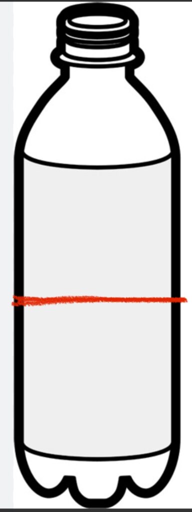 1、風船に小麦粉と入れるためのロートがわりになるものをペットボトルを使います。ペットボトルは赤の線あたりでカット。私はこれよりももっと上部分でカットしてしまい小麦粉を入れる時にとってもやりにくかった笑。